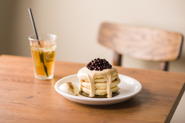 タピオカ粉を入れてつくるパンケーキ生地はもちもちふわふわの食感。それを4層重ねた上からなめらかなクリームをのせ、最後にタピオカを盛り付けます。タピオカは、紅茶、ストロベリー、マンゴー、抹茶の4つのフレーバーから選べ、馴染みのあるもちもちの食感に加えてそれぞれの風味を感じることができるようになっています。