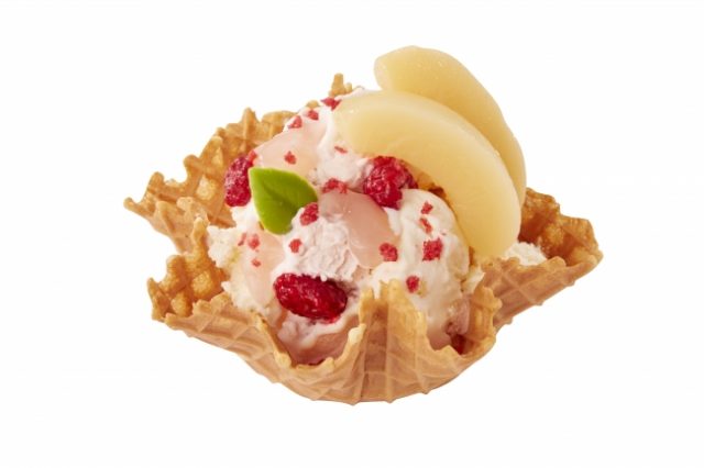 ピンクピーチアイスクリーム、フレンチバニラアイスクリーム、ラズベリー、ピーチジュレ、国産白桃、ラズベリーチップ、リーフチョコ