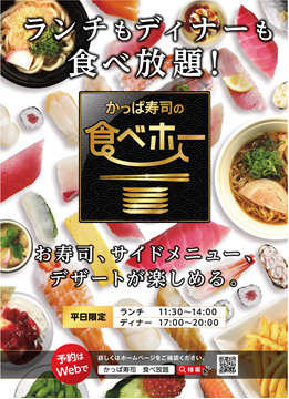 「かっぱ寿司の食べホー」では、以前より多くのお客から「ランチやディナータイムに全店舗で実施してほしい」という声をいただいていました。この度、お客の声に応え「かっぱ寿司の食べホー」は、時間帯を平日のランチタイムの11時30分~14時、ディナータイムの17時~20時に、そして対象店舗を全店舗に拡大します。