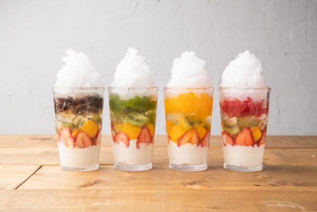 かき氷の下にはタピオカ、ゼリー、カットフルーツ、パンナコッタと4つの層になっており、見た目がカラフル!タピオカは、ブラックティー、抹茶、マンゴー、ストロベリーの4つのフレーバーから選べ、馴染みのあるもちもちの食感に加えてそれぞれの風味を感じることができ、タピオカのフレーバーに合わせたシロップをかき氷の上からかけて仕上げます。