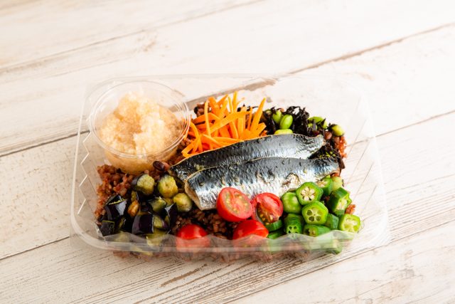 イワシのオイルサーディン、トマトや茄子、オクラなどの夏野菜と栄養たっぷりの酵素玄米を、さっぱりとしたおろしポン酢で味わう和風サラダボウルとなっています。