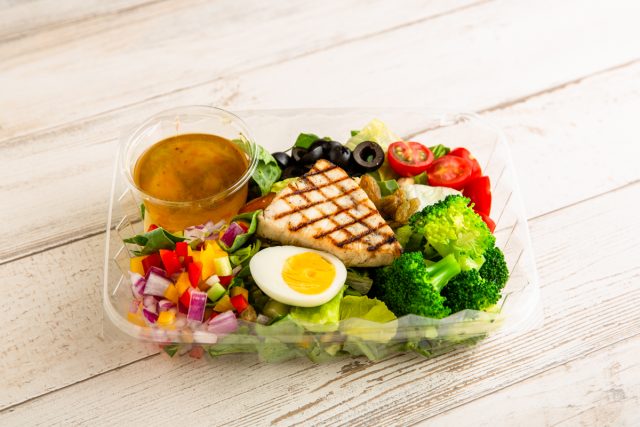 メカジキのグリルやゆで卵がのった、野菜とたんぱく質がもりもりと食べられるパワーサラダ。糖質制限されている方にもおすすめとなっています。