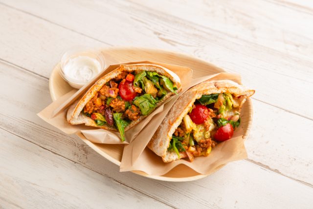 ヴィーガンタコミートを使用したピタサンド。スパイシーでピリ辛な味付けが食欲をそそります。(ハーフサイズは550円)