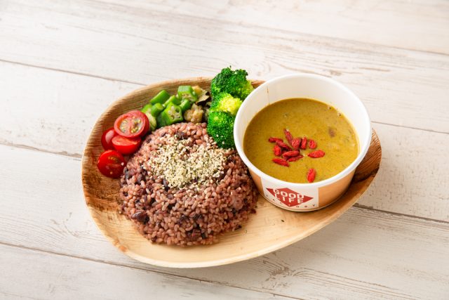 「今日はどうしてもカレー気分!」という時でも罪悪感少なく食べられるようになっています。薬膳ココナッツカレーに、夏野菜を添えたヘルシーカレーとなっています。ご飯は栄養価の高い酵素玄米を使用しています。