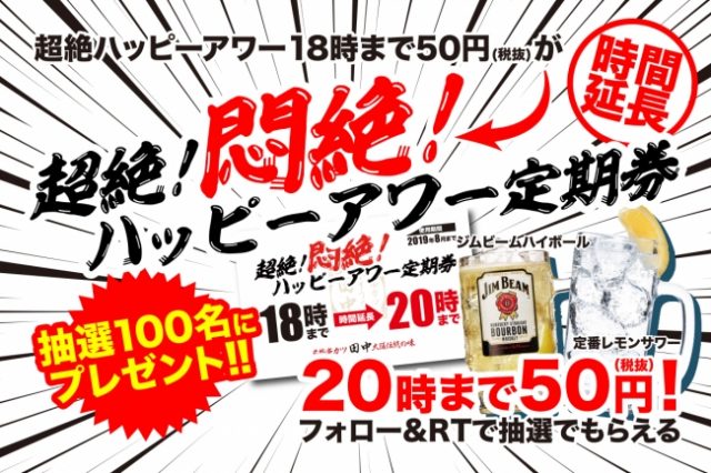 さらに、この度「定時が18時に間に合わない」というお客様からの声を受けて、20時まで「超絶ハッピーアワー」を楽しめる「超絶!悶絶!ハッピーアワー定期券」を提供することが決定しました。早い時間帯に来店されたお客様に、“ちょい飲み”のひとときをハッピーに過ごしてもらうことで、串カツ田中は“働き方改革”を応援します。同券は、公式Twitterアカウントをフォローし該当のツイートをリツイートした方を対象に、抽選で100名様に当たります。