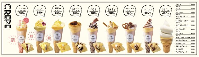 関西の既存店でも人気のバニラビーンズ入りのカスタードとキャラメリゼが香ばしいクレームブリュレクレープや、定番のチョコバナナクレープなどのメニューはそのままに、SHIBUYA109店限定のレインボーマシュマロクレープを用意しました。(680円税込)