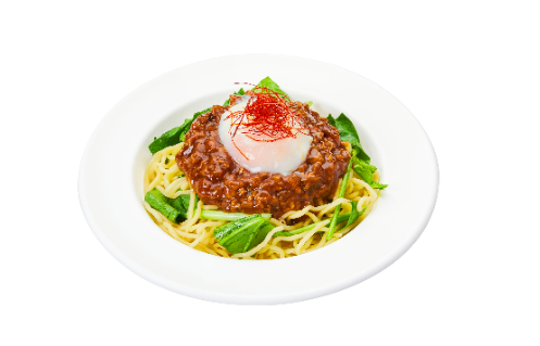 商品説明:豚肉、筍、椎茸がたっぷり入った、甘辛のコクのある肉味噌に、とろーり半熟たまごが乗った冷やし麺となっています。