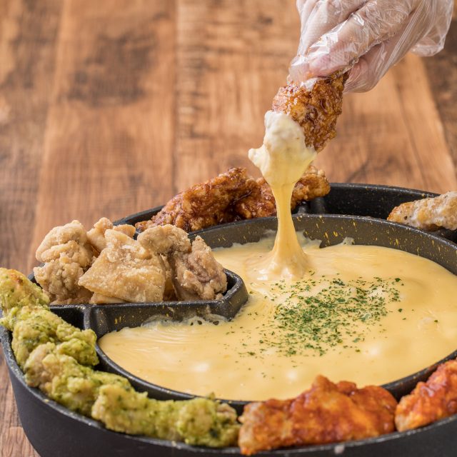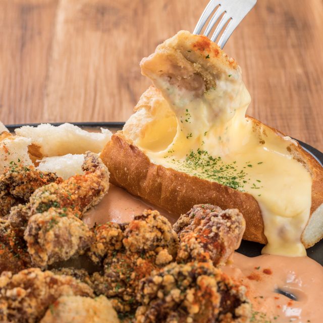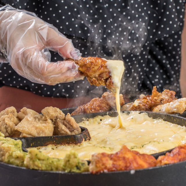 こちらもインスタグラム、TwitterなどSNSで話題になっている新感覚のチーズグルメ!大きなパンの中にはチーズがなみなみと溢れんばかりに入っており、パンの周りにはフライドチキン、そしてトマトベースのソースがかかった一品となっています。