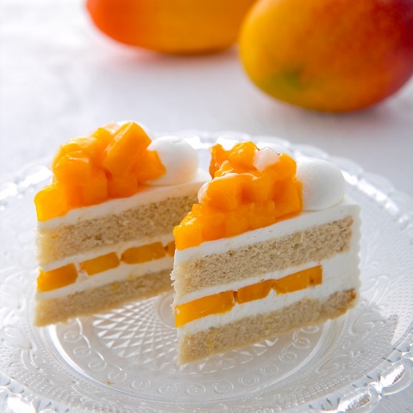 「新エクストラスーパーマンゴーショートケーキ」・・・香り高く、高い糖度で、とろけるような「国産アップルマンゴー」を贅沢に1/2使用し、今年はみずみずしいライチもトッピング。スポンジには玄米を食べて育った「玄米卵」、クリームには軽い後味が印象的な「アーモンドミルクシャンティ」、「マンゴーシャンティクリーム」を使用し、主役のマンゴーを引き立て、夏の訪れを感じさせる爽やかな味わいに仕上げました。