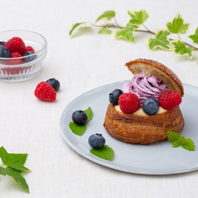 サックリした食感が人気のシュークロワッサンにカスタードとブルーベリークリームを二層に重ね、ブルーベリーとラズベリーを飾りました。見た目も華やかな、特別なシュークロワッサンとなっています。