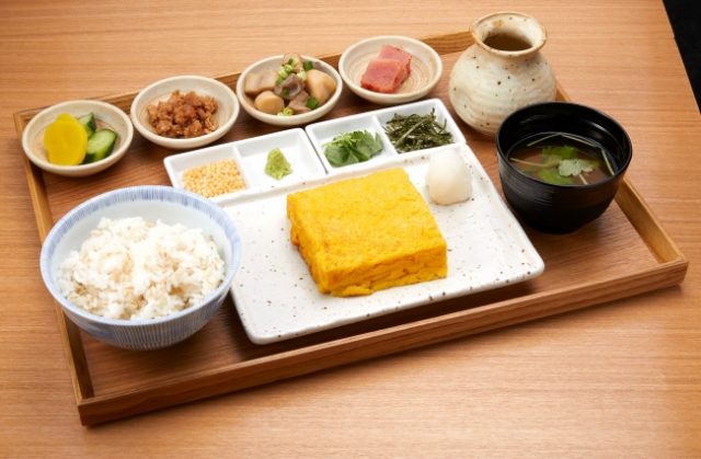 ランチ玉子焼定食・・焼きたて玉子焼、小鉢三種、麦ごはん、味噌汁など。890円