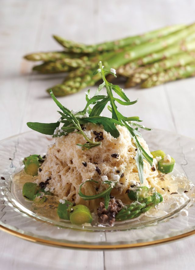 商品説明:カルボナーラをフワフワのかき氷で楽しむ、名古屋店限定のスノーアイスパスタ。味の決め手は、瑞々しいアスパラガスと芳醇な香りを放つサマートリュフ。クリーミーなのに、清涼感もある絶妙なバランスの新作パスタとなっています。※ディナータイムは、サービス料として10%加わります