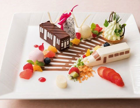 高層階レストランの“トレインビューシート”で味わう1日4食限定ランチコース。食後のひとときを電車型ケーキが彩ります。
