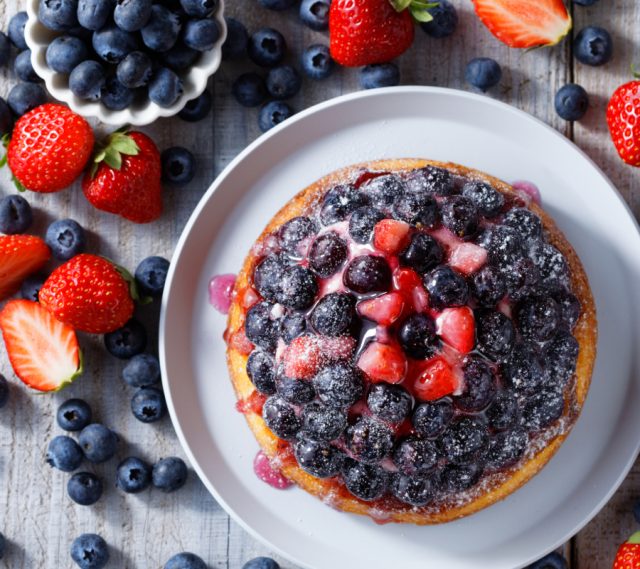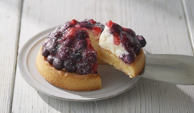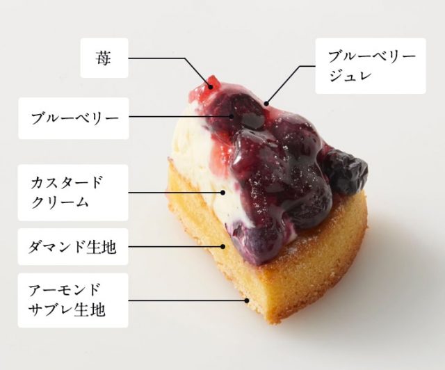 たっぷりしきつめられたブルーベリーに苺が華やかさを添えた、2種のベリーの甘酸っぱいタルトとなっています。使用しているブルーベリーは、加工をしていないので本来の味とぷちっとした食感を楽しめるようになっています。