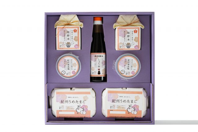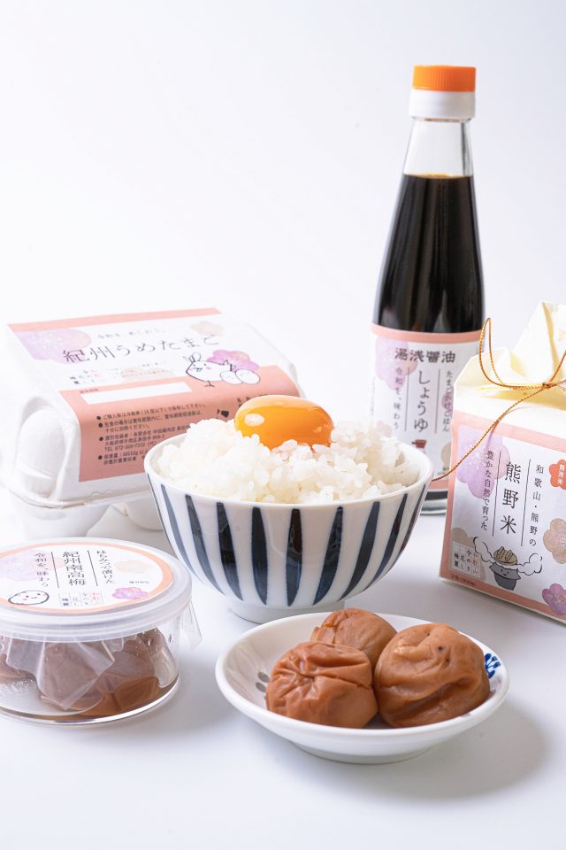 生産者さんの想いがたっぷりと注がれ、和歌山の梅を再利用して生まれた、紀州うめたまご、熊野米、卵かけごはん専用しょうゆ、そして紀州南高梅の梅干しがセットになっています。食材がすべて梅つながりの、和歌山ならではのギフトとなっています。