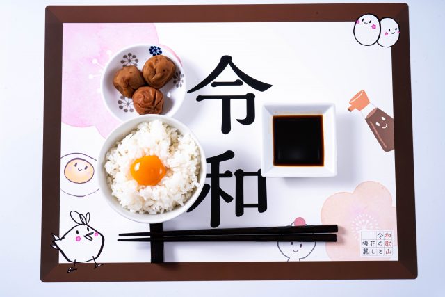 ランチョンマットを墨書のように掲げたら、誰でも令和ムードに。そんな気分に浸りながら食べる卵かけごはんの味もまた格別です。