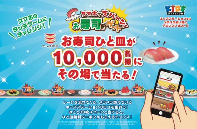 コロワイドグループのかっぱ寿司と、こども・アニメ専門チャンネル キッズステーションは、2019年7月13日(土)より、かっぱ寿司のお寿司ひと皿(※注)が1万名様にその場で当たる“スマホでズバーン!お寿司をゲット”キャンペーンを実施します。