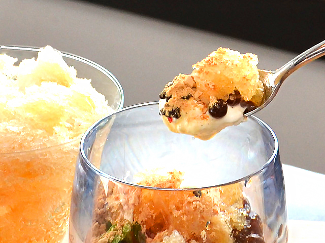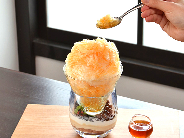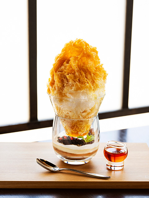 アールグレイ茶葉を煮出して作った自家製紅茶蜜をかけて食べる、天然氷を使用したふわふわのかき氷。下のグラスに入ったミルクティーゼリー、ブラックタピオカとクランチクッキーはトッピングしたり、そのままで食べたりと様々な楽しみ方で味わえる、進化型かき氷となっています。