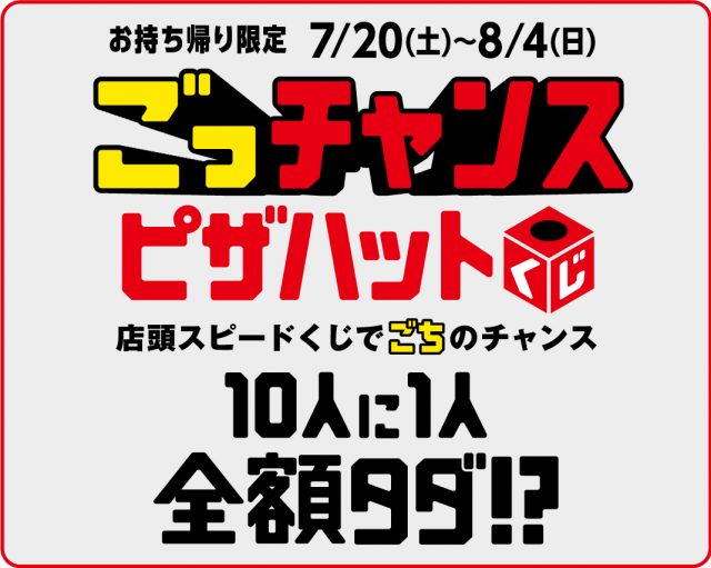 日本ピザハット株式会社が展開する世界最大のピザチェーン「ピザハット」は、暑い夏を楽しく元気に過ごせるよう、店頭でスピードくじを引くと10人に1人の確率で全額タダになるチャンスがある「ごっチャンス ピザハットくじ」を、2019年7月20日(土)~8月4日(日)に実施します。
