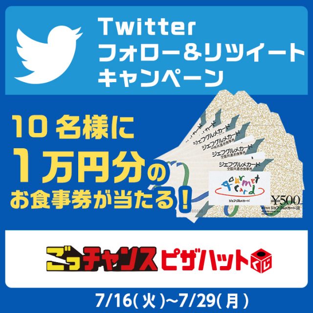 「ごっチャンス ピザハットくじ」に先行して、抽選で10名に“1万円分のお食事券”が当たる!Twitterフォロー&リツイートキャンペーンも実施します。