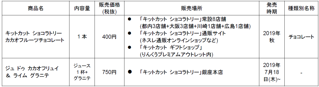 2019年秋の日本での発売後、2020年以降に世界の国々でも展開していく予定の“カカオフルーツチョコレート”は、カカオの豆と、その周囲を覆う白い果肉「カカオパルプ」を使用することで実現する、芳醇な甘味や酸味が特徴となっています。髙木シェフは、「カカオもフルーツの一つであることに着目し、カカオまるごとの美味しさを提供するようなイノベーションである」と評価しています。さらに、その魅力を存分に味わってもらうため、「カカオフルーツジュース」を使用したスイーツセットも「キットカット ショコラトリー」銀座本店のカフェスペース限定で販売する予定です。