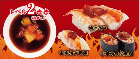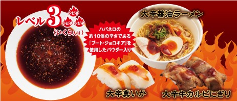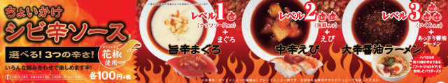 ソースの辛さは三段階のレベル。『まぐろ』や『えび』などの定番のお寿司や『フライドポテト』や『うどん』、『ラーメン』などのサイドメニューにちょいかけすることで、夏にピッタリのシビ辛味となり、いつもとはまた違った味わいを楽しめるようになっています。