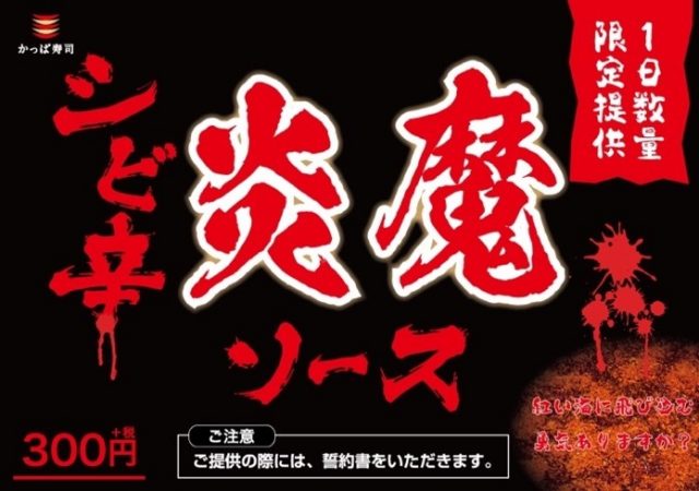 そしてかっぱ寿司からの、この夏の挑戦状メニュー!『シビ辛 炎魔ソース』が各店舗1日数量限定提供で登場。挑戦する際には、「シビ辛炎魔ソース免責同意書(誓約書)」を承諾の上、署名したお客のみ挑戦が可能となっています。