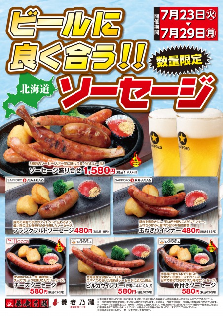 養老乃瀧株式会社は、グループチェーン「養老乃瀧」、「だんまや水産」、「輪囲」にて、ビールをより一層、おいしく楽しめる北海道産のソーセージを厳選した『ビールに良く合う北海道ソーセージフェア』を、2019年7月23日(火)~29日(月)の期間、数量限定で販売します。※同時に一部店舗では、「生ビール&北海道ソーセージフェア」としてサッポロ生ビール黒ラベル<樽生>(中)を299円(税込323円)での販売を実施します。