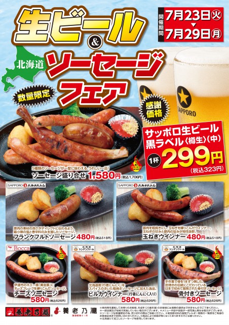 ※生ビール&北海道ソーセージフェアの実施店舗はサッポロ生ビール黒ラベル<樽生>(中)を