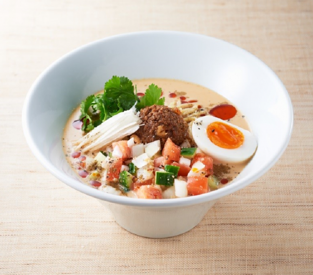 ゴマの風味豊かなまろやかな冷製担々スープは、ラー油をプラスしピリ辛に仕上げました。中央の豆板醤や甜麺醤などを独自に配合した肉味噌を細かくほぐし、スープに溶かして味変しながら味わえるようになっています。ゴロっと美味しい彩り野菜にパクチーなどの香草を添えて、濃厚な担々スープの旨味と辛味を余すことなく楽しめるようになっています。