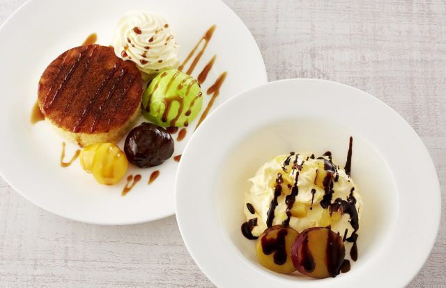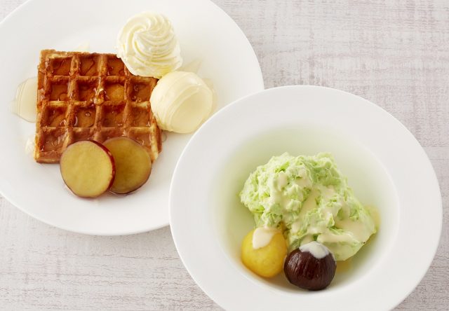 できたてを席まで届ける「デモンストレーションメニュー」には、「栗のパンケーキ 抹茶アイス添え」(9月1日(日)~22日(日))、「さつまいものワッフル バニラアイス添え」(11月1日(金)~22日(金))を提供します。