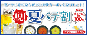 昨年実施して大好評だった「脱!夏バテ割」を今年も開催しています。「脱!夏バテ割」とは、地域毎の気温や湿度等の予測を元に、対象店舗を決めるキャンペーンとなっています。対象店舗では生ビールやタピオカドリンクなど、各種ドリンクが何杯でも100円で注文できるなど、様々な特典が付与され、お客の夏バテ対策を応援します。