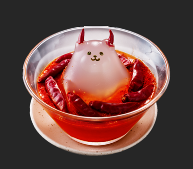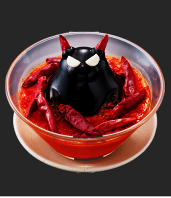 更に辛さを求める一部の激辛マニアのために、店舗限定で「超激辛!デビル鍋」を提供します。まるで、煮えたぎるマグマのような赤いとろろに浸るのは、「漆黒デビルコラーゲン」です。唐辛子の辛さに加えデスソースや山椒など、酸味やシビレの要素を加えることで、より奥深い辛味を楽しんでもらえるようになっています。その辛さは先述の「激辛!小悪魔鍋」の約2倍。激辛好きな人だけ注文ください。