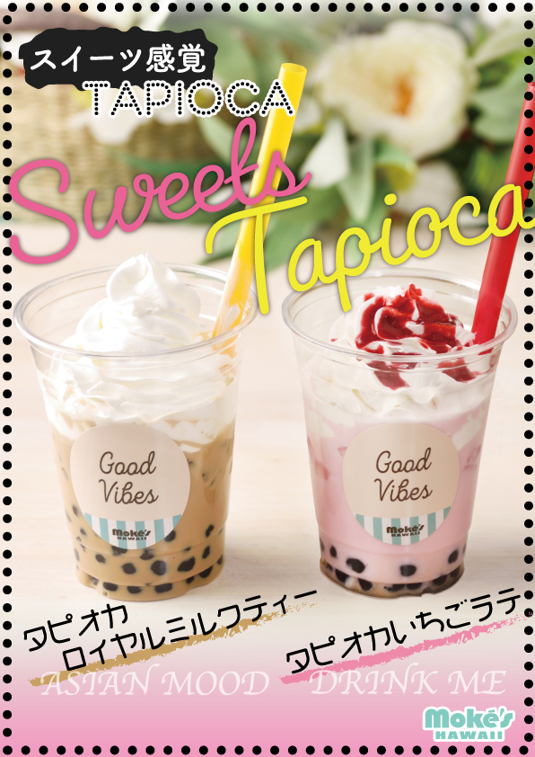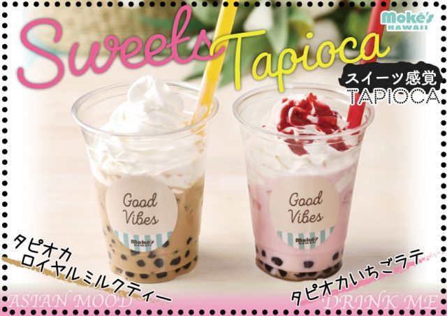 ハワイで行列のできる人気店「モケス ハワイ」より、タピオカホイップミルクティー&タピオカイチゴラテホイップを発売開始しました。