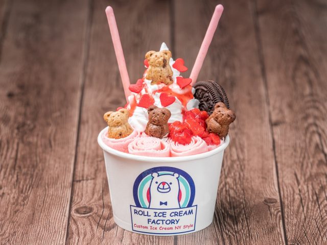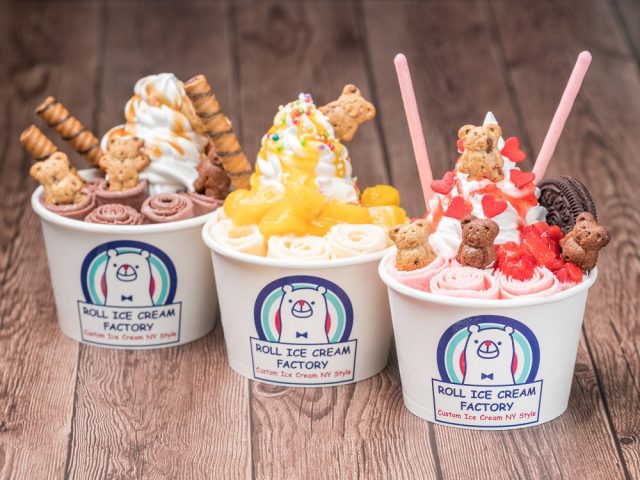 タイの屋台が発祥と言われているロールアイスクリームは、ニューヨークで大ブームを起こした新スタイルのスイーツです。マイナス10℃以下のコールドプレートにクリーム状のアイスを落とし、ヘラでくるくるっと巻き上げて作ります。作られる工程を見ているだけでもワクワク感が止まらない、フォトジェニックなアイスクリームとなっています。