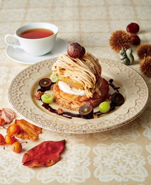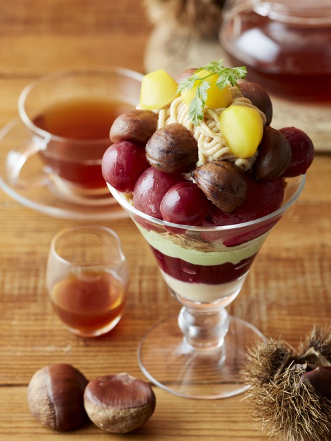 商品説明:アフタヌーンティー38周年を記念した3日間限定のスペシャルパフェ。たっぷりの渋皮栗と焼きぶどうに、自家製カシスゼリー、ピスタチオクリーム、フィアンティーヌ、バニラアイス、カシスシャーベット、イタリア産の栗を使ったモンブランクリームを重ねた栗づくしのパフェ。アールグレイソースをかけて味の変化を楽しめるようになっています。(14時~、各店数量限定)