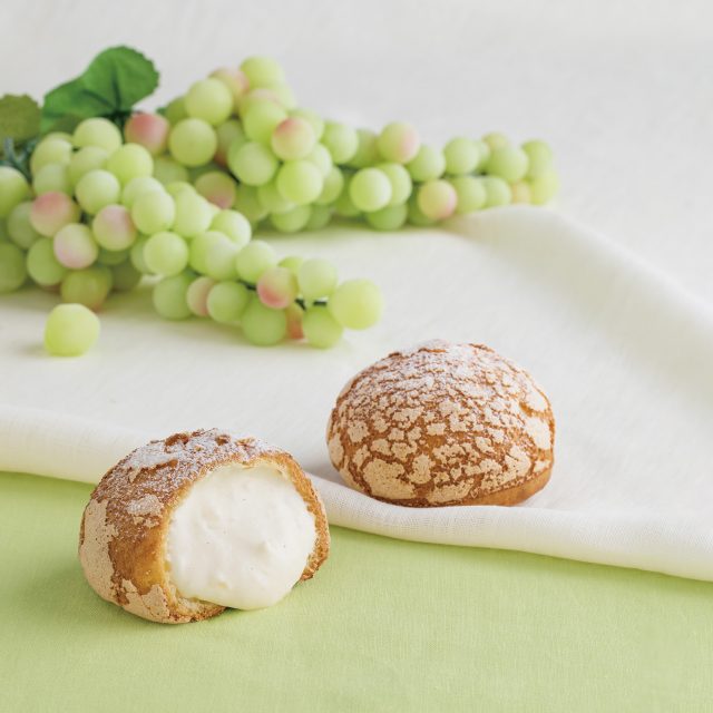 白ぶどうの王道品種シャルドネが爽やかに香る大人の一品。三層が織りなす食感豊かなシュー生地とともに楽しめるようになっています。