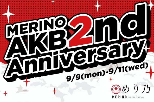 美容効果の高い栄養素が豊富なラム肉を使ったしゃぶしゃぶ 焼肉食べ放題「めり乃 秋葉原本店」は、【オープン2周年】を記念して、”ラムしゃぶ+タンしゃぶ食べ放題+Soft飲み放題付コース(通常4,480円)”または”ラム&マトン7種食べ放題+Soft飲み放題付コース(通常3,980円)”を2,900円で提供する『オープン2周年感謝祭』を、2019年9月9日(月)~11日(水)の3日間、実施します。