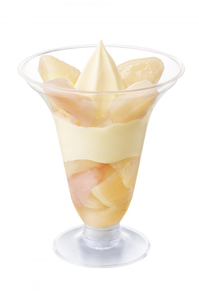 果肉は加熱せず製造することで、白桃本来の食感を味わえるようになっています。完熟した白桃の甘みと柔らかでジューシーな果肉が「ソフトクリーム バニラ」と合わさることで、最後まで飽きずに美味しく楽しめるようになっています。