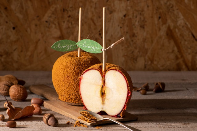 新鮮なりんごを丸ごと使ったりんご飴に、キャラメルパウダーで秋のよそおいに。一味違うアメリカン?!な新体験の味。