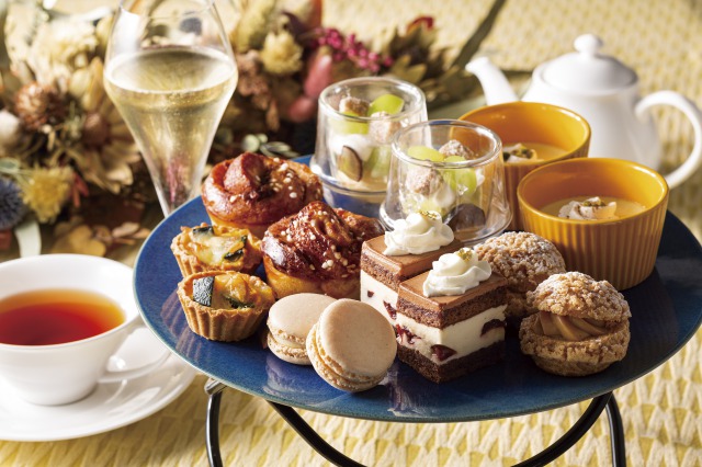 濃厚な北海道産えびすかぼちゃを使った「かぼちゃのプリン」、アーモンドプラリネを入れたクリームをサンドした「シュープラリネ」など、秋の味覚も取り入れました。その他、ショコラとチェリーが織りなすフランスの伝統ケーキ「フォレノワール」など7種類のデザートやお料理がセットに。ゆっくり、少しずつ色々楽しめるのが嬉しいポイントとなっています。