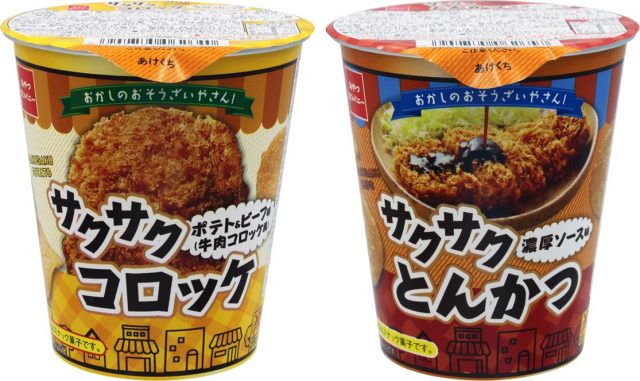 味は「サクサクコロッケ(ポテト&ビーフ味 牛肉コロッケ風)」と「サクサクとんかつ(濃厚ソース味)」の2品。お惣菜屋さんのコロッケ、とんかつをイメージした旨味たっぷりのチップス生地に、パン粉をまとわせてサクサク衣のチップスに仕上げました。