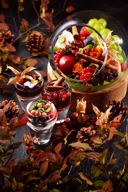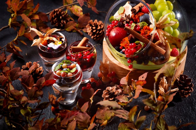 クランベリー、ブラックベリー、カシス、ラズベリー、ゴールデンベリー、ブルーベリーなど、爽やかなベリー類をふんだんに使ったスイーツ約30種類がブッフェ台に登場。大粒のブルーベリーがたっぷりと乗った「フレッシュ ブルーベリータルト」や、シグネチャーアイテムであるオペラにベリーを掛け合わせた「カシスとキャラメルナッツオペラ」など、多彩なベリースイーツを期間限定で提供します。涼しくなり、秋めく11月に、「キノコとゴールデンベリーのキッシュ」など温かいアイテムも多く取り入れました。さまざまなベリーソースを使い、目でも楽しめる「クレープと6種のベリーソース」はライブキッチンにて用意。ベリー類を贅沢に使用したスイーツブッフェを開催するのは、開業以来初となります。是非「秋のベリースイーツブッフェ」で秋の季節感も楽しめるようになっています。