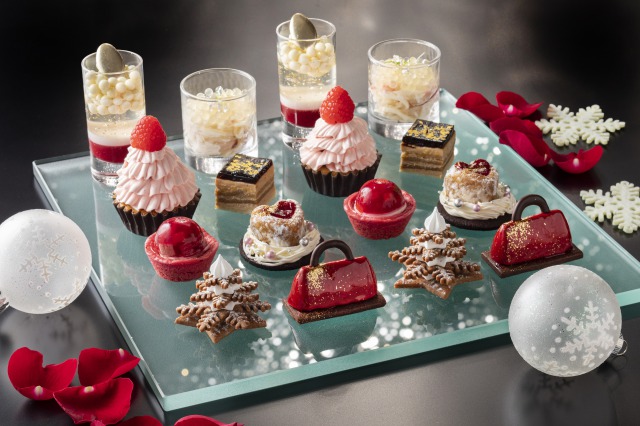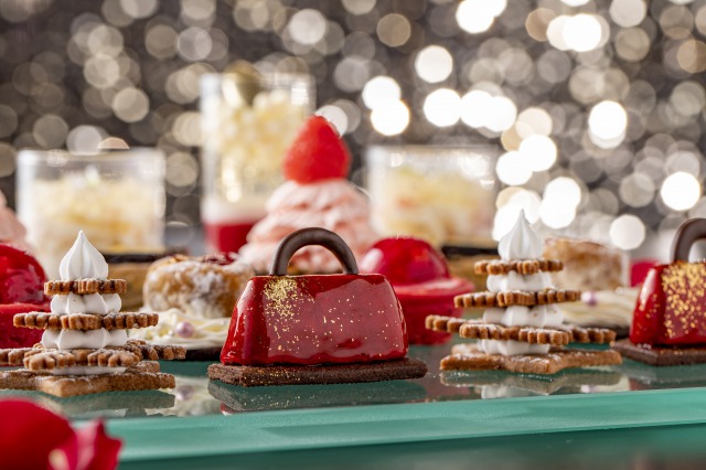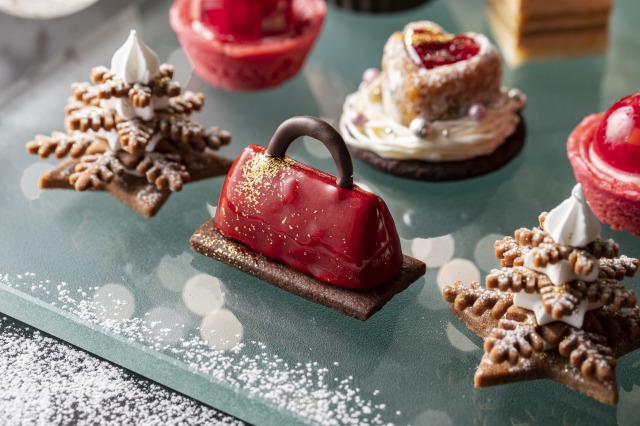 可憐な赤やホワイトで彩られたフォトジェニックなプレートには、旬の高級食材を使ったエレガントかつ独創的なアイテムが並びます。目を惹くのは艶やかな赤いハンドバッグ。口に入れるとビターな味わいが広がり、ふわっと溶ける70%チョコレートムースと、サクッとしたチョコサブレのバランスが絶妙となっています。ラズベリーを乗せた「ストロベリーカップケーキ」はいちごを丸ごと一粒入れ、バタークリームで丁寧にドレープを重ねて、美しいピンクのドレスに仕上げました。ドレスに合わせて、女性を美しく飾るジュエリーからインスパイアされたグラスデザートは、ラズベリージュレ、パンナコッタ、モミの木のはちみつを使い、香りがスパイシーなゼリーの三層に。ゴールドのドラジェをイヤリングに見立て、クリスマスオーナメントとイルミネーションの輝きをホワイトチョコレートとモミの木のはちみつを使ったゼリーに舞う金粉で表現しています。そのほか、ホリデーシーズンを演出するジンジャーブレッドで作ったスノーツリーや、スパイスをふんだんに使い、ラズベリーの酸味が効いたハート型のシュトーレンは上品な味わいが楽しめるようになっています。