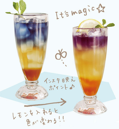 最初はコバルトブルー色をしているのですが、酸味成分を加える事によって色が徐々にパープル色に変化します。
