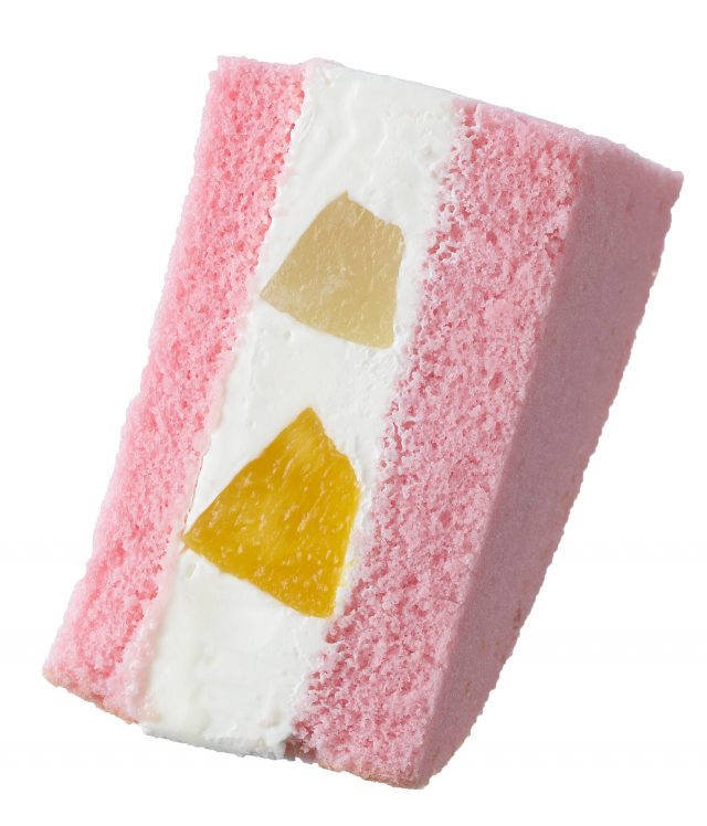 ふわふわピーチ風味スポンジで白桃&黄桃とチーズクリームをサンド。ピーチとチーズクリームがマッチした、爽やかなおいしさ。