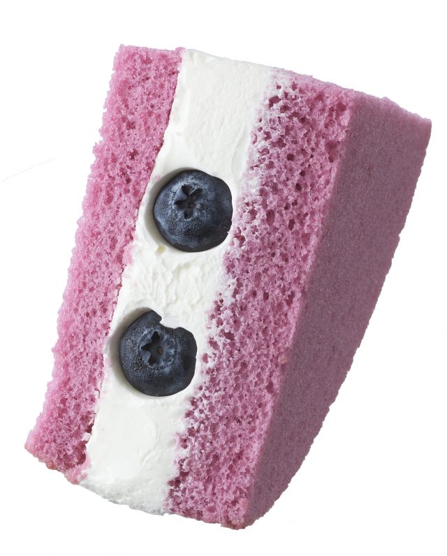 ふわふわブルーベリー風味スポンジでブルーベリーと甘酸っぱいヨーグルト風味クリームをサンド。さっぱりとしたおいしさに仕上げました。