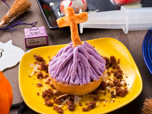 ハロウィンコースは、チーズで目玉を模した前菜からスタートし、通常メニューでも人気のミイラ男のシーザーサラダや、ソーセージモンスターピザ、顔の描かれたチーズリゾットなど、遊び心たっぷりの料理が全8品となっています。スイーツは紫色のお墓のタルト。モンブランテイストのスイーツは単品でも注文できるようになっています。