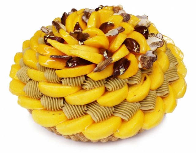 みずみずしい果肉で甘みたっぷりの奈良県産の柿を、宇治茶祇園辻利のほうじ茶クリームと合わせ、カスタードクリームのベースにふんだんに飾り付けてあります。