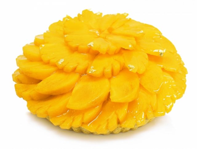 大玉で糖度が高く、みずみずしい果肉の福岡県産「秋王」を贅沢に使用し、マスカルポーネベースに美しく飾り付けてあります。秋王は富有柿と大秋柿を掛け合わせ、福岡県が開発した、世界初の種なし甘柿です。今年4周年を迎えた福岡県オリジナル品種で、鮮やかな色合い、濃厚な甘さとサクサクした食感、溢れる果汁が特徴です。